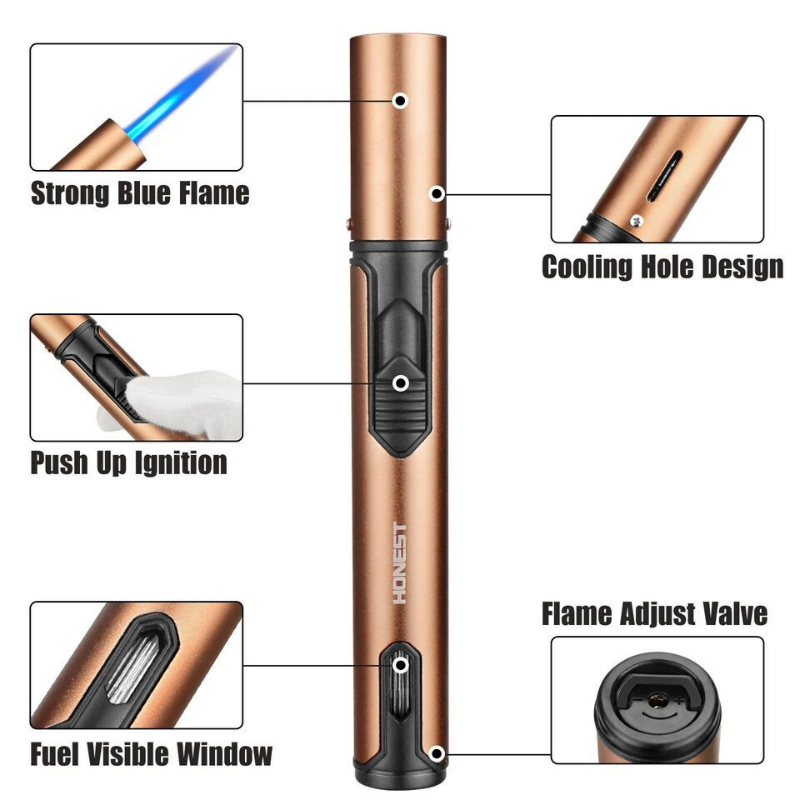WINDPROOF & ADJUSTABLE FLAME: The torch jet flame is concentrated in the steady ceramic nozzle, Maximum temperature up to 2800°F, it can easily against outdoor wind. You can adjust the flame valve at the bottom to adjust the flame level without any tools, from small flame to strong flame, Very convenient. ATTENTION: This flame lighter contains no butane due to DOT and USPS Safety Regulations.