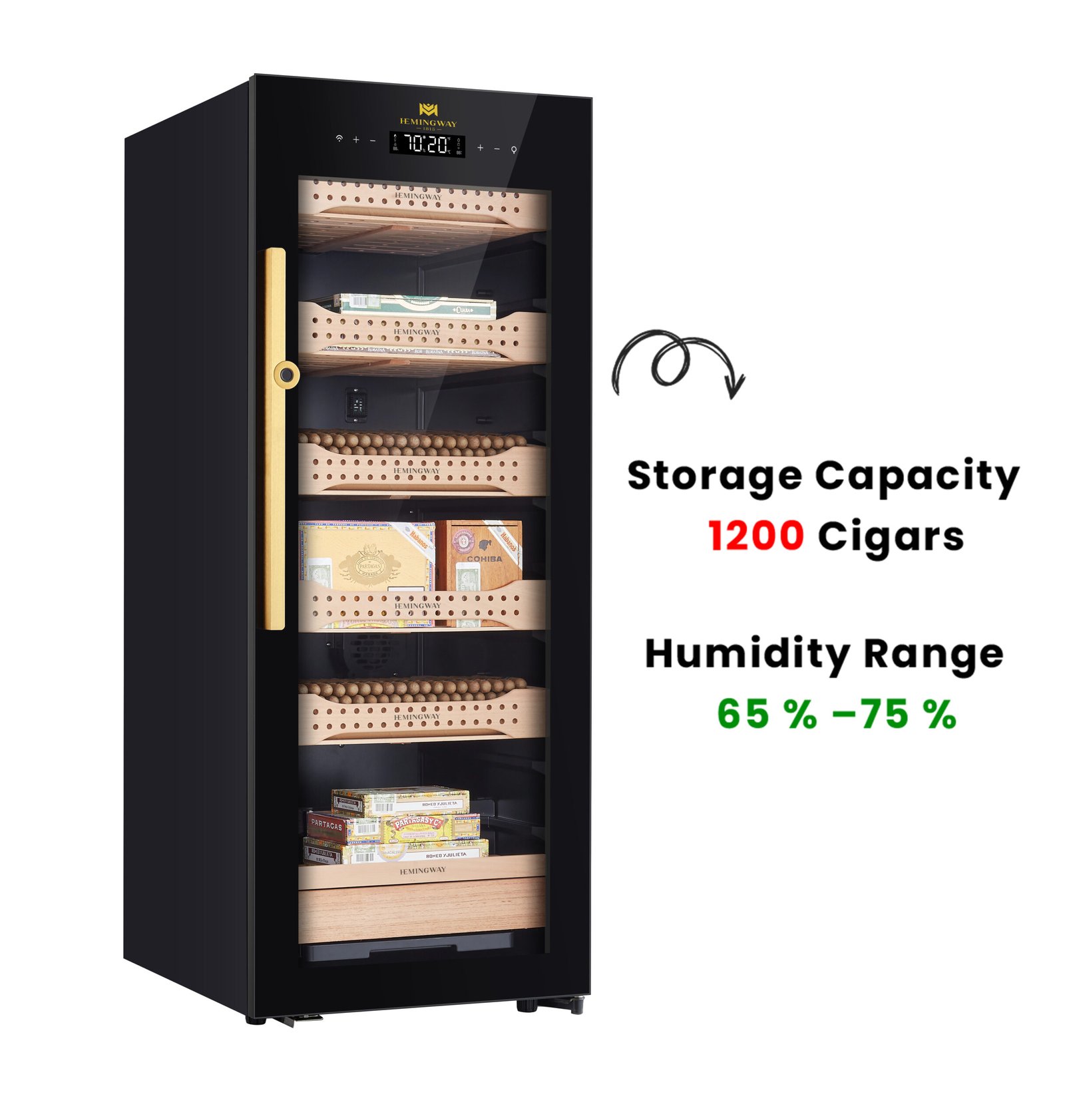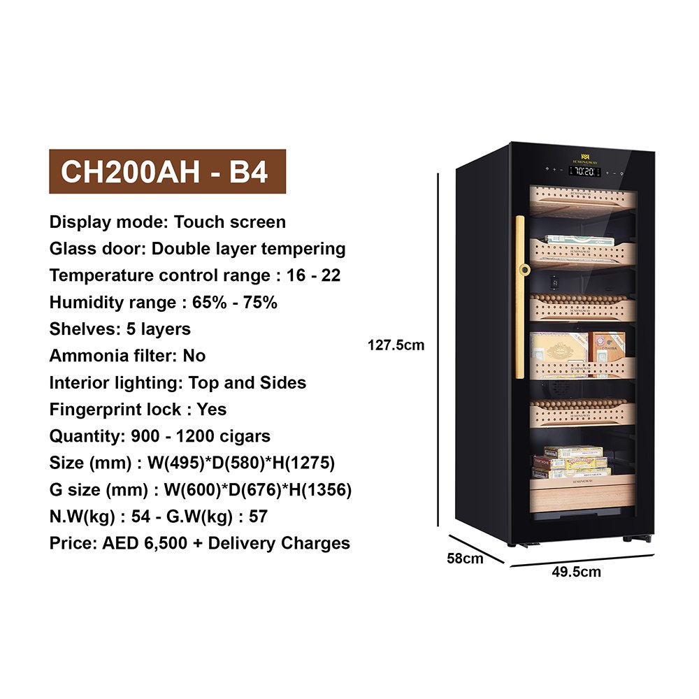 The Hemingway CH200 Electric Cigar Humidor offers professional-grade cigar preservation for collectors and enthusiasts. With a capacity of 900–1200 cigars, it features 5 Spanish cedar shelves, ideal for maintaining flavor and optimal humidity (65–75%). The unit includes a digital touchscreen for precise control of temperature (16–22°C) and humidity levels. The double-layer tempered glass door provides elegant protection, while the top and side LED lighting showcases your collection. Security is enhanced with a fingerprint lock system. With a sleek black finish and quiet performance, the CH200 is the perfect addition to lounges, home cigar rooms, and upscale gift buyers. Dimensions: 600mm W x 676mm D x 1356mm H | Net Weight: 48kg