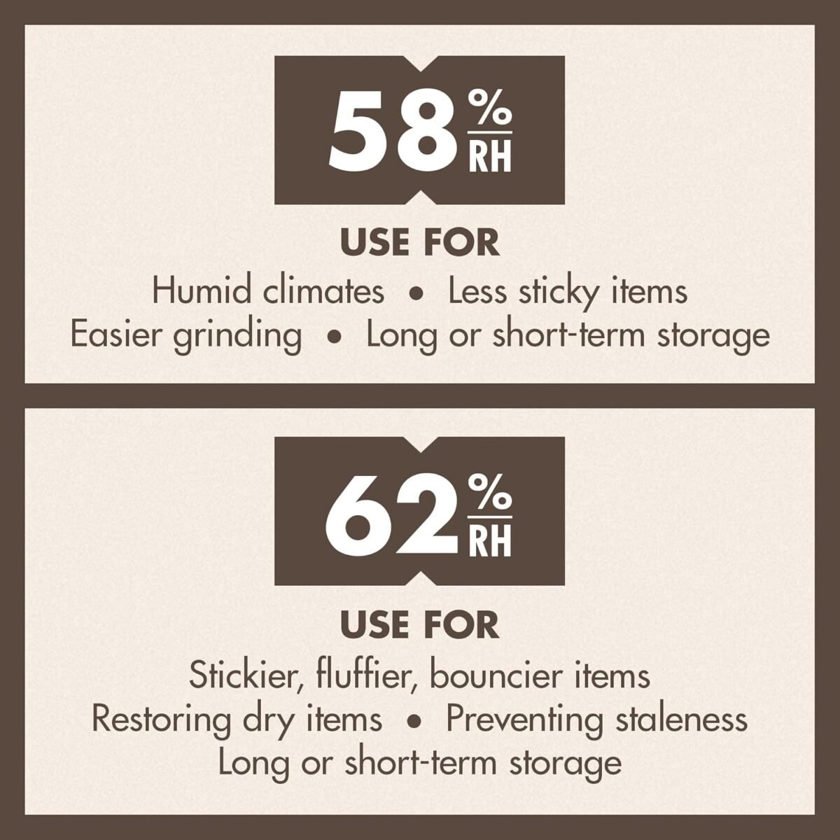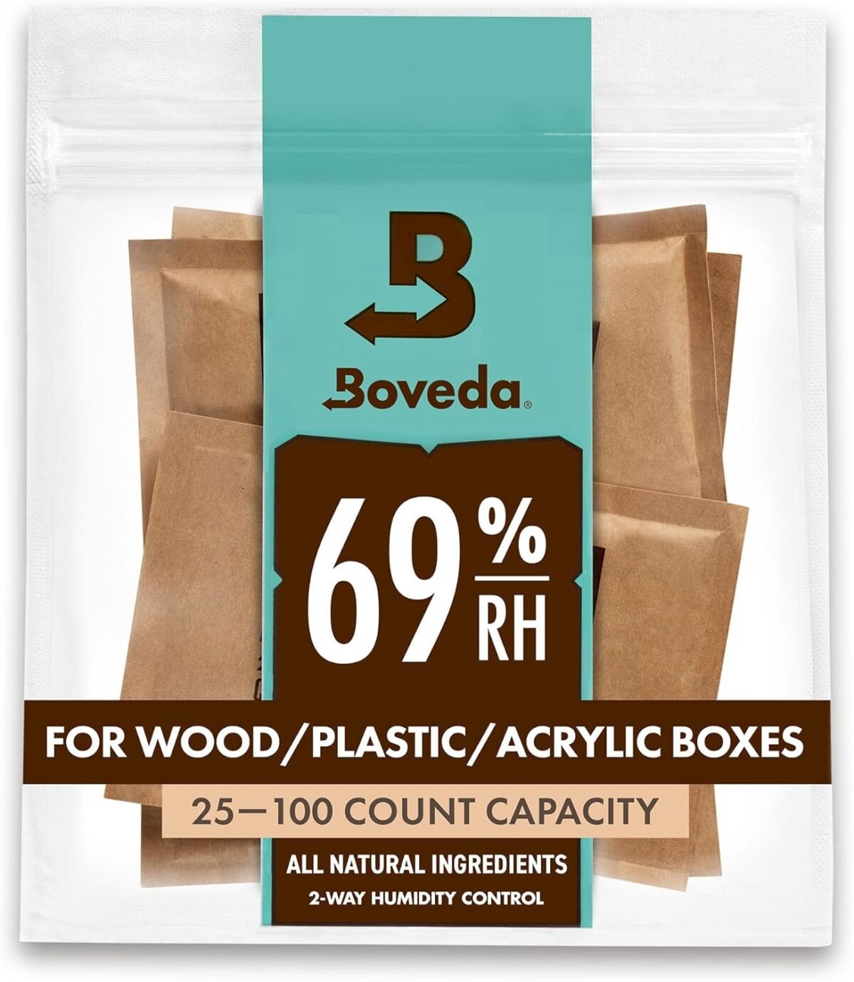 - WHY THIS BOVEDA: 69% RH is the sweet spot for storing premiums in plastic food storage containers & airtight wooden containers. Use one 5.25″x3.5″ humidifier packet for every 25 TOTAL items your humidifier box can hold. NATURAL INGREDIENTS. Trusted by over 3 million people to protect & maintain items at the perfect humidity level. WE GUARANTEE QUALITY! If you’re not 100% satisfied, reach out for a full refund for up to 1 year.