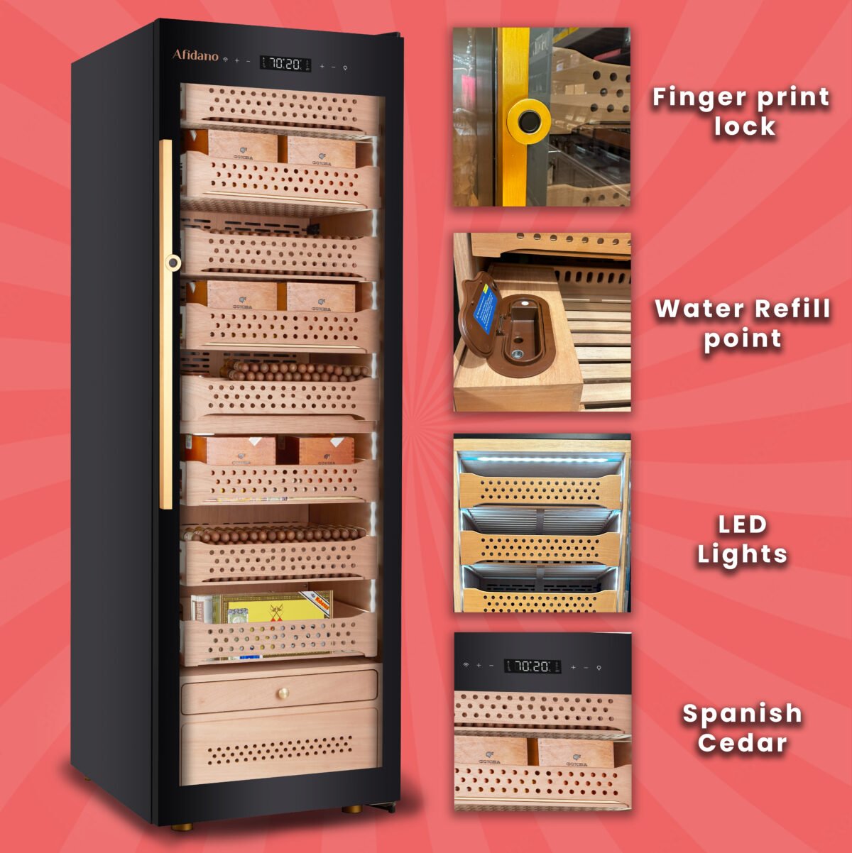 Experience the pinnacle of cigar storage with the Afidano B8 Electric Humidor Cabinet. Designed for the serious collector, this humidor offers a massive 2200-cigar capacity with precise temperature and humidity control. The rich Spanish cedar drawers and shelving create the ideal aging environment, while the advanced technology ensures your cigars are perfectly preserved. Protect your investment and enhance flavor with this ultimate cigar cabinet