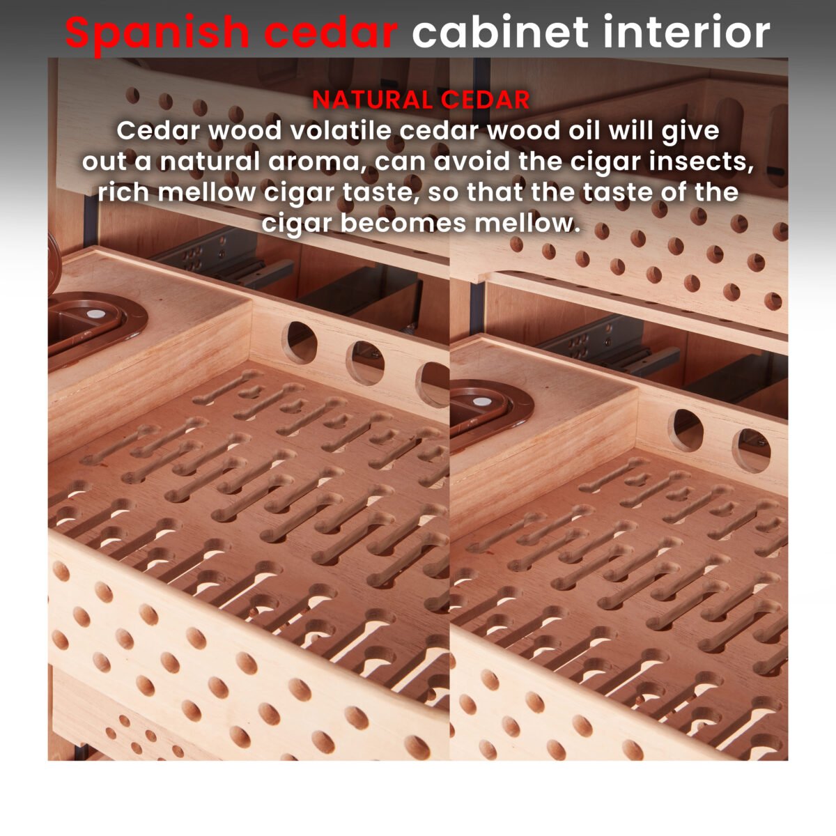 The HPR system has 6 components that ensure the accuracy and reliability of temperature and humidity, maintaining the perfect climate for your cigars. Temperature range: 62-74°F; Humidity Range: 60-75%. You can have peace of mind knowing your cigars are being kept in optimal conditions.