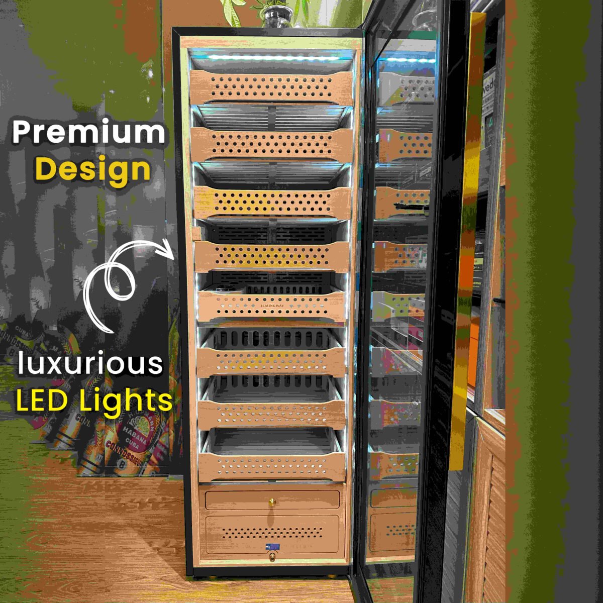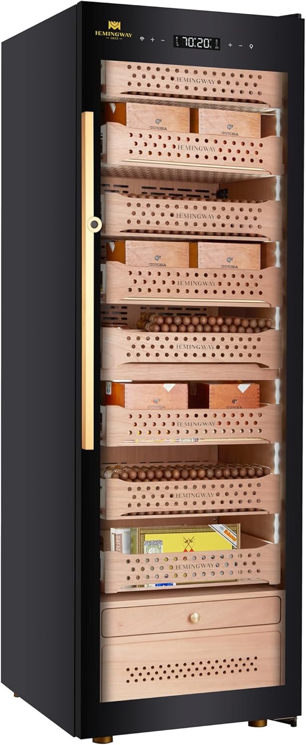 Hemingway Electric Humidor 1500-count cigar humidor is a spacious and luxurious storage solution designed to accommodate a substantial collection of cigars. This humidor is built to maintain optimal conditions for cigar aging, ensuring that each cigar is preserved in the best possible state for an extended period.