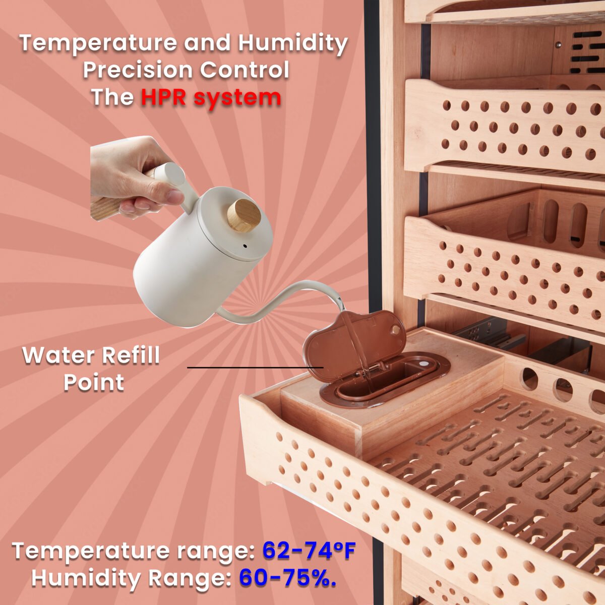 The HPR system has 6 components that ensure the accuracy and reliability of temperature and humidity, maintaining the perfect climate for your cigars. Temperature range: 62-74°F; Humidity Range: 60-75%. You can have peace of mind knowing your cigars are being kept in optimal conditions.